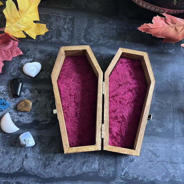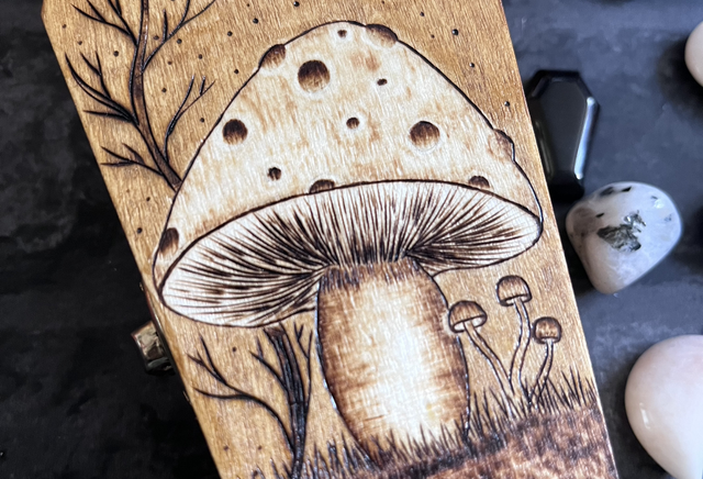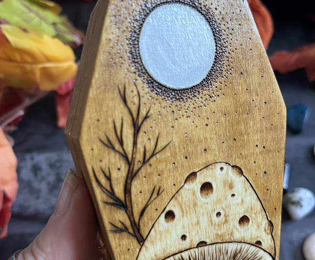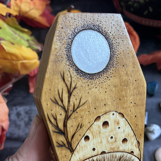 This is a beautiful coffin shaped box with a handburnt large mushroom and moon design, with a bare tree in the background. All my designs are designed by me, are hand drawn and hand burnt with a Pyrography tool, making each piece unique.