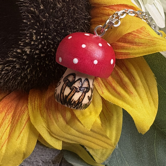 An adorable little mushroom shape that I have hand burnt designs on to, going all around the stem, this one has mushrooms and vines on it, I do have other designs available. I’ve painted the top with a red watercolour and added white acrylic paint dots. It has been sealed with a hard wearing varnish to help protect it.