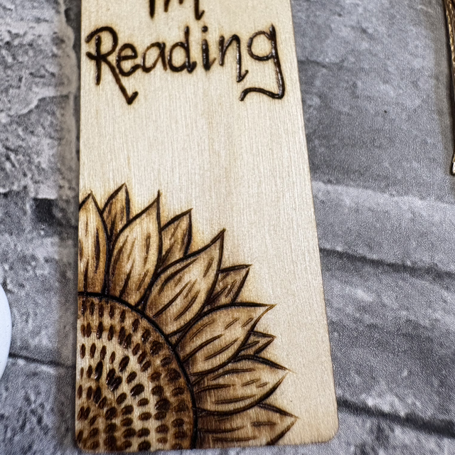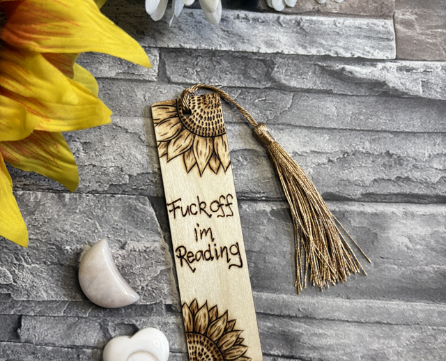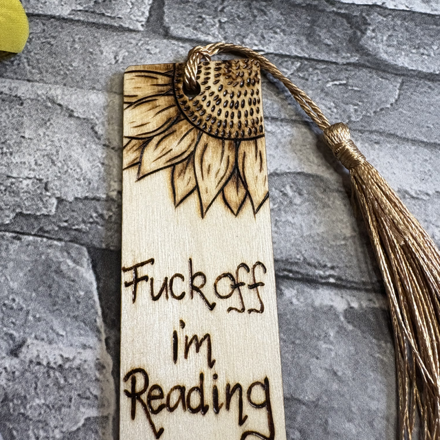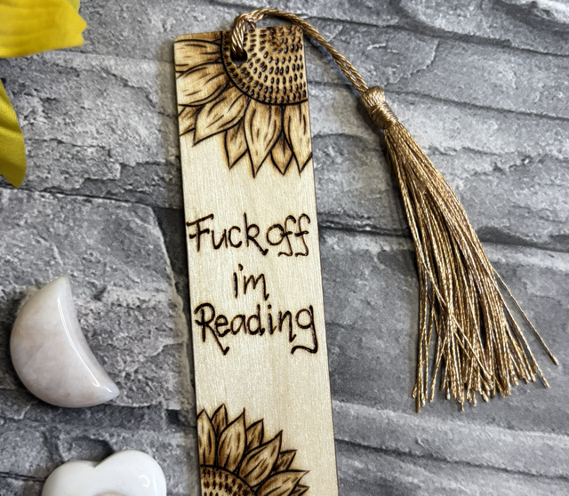 This one has the words, ‘fuck off I'm reading’ with two sunflowers burnt into opposite corners. And comes with a dark gold tassel.