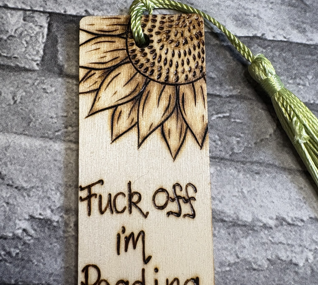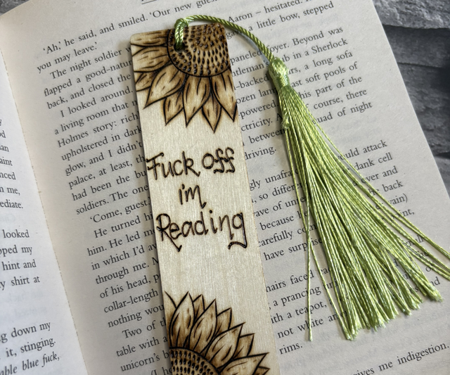 F*ck off I’m reading handburnt sunflower design bookmark. Pyrography art.