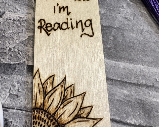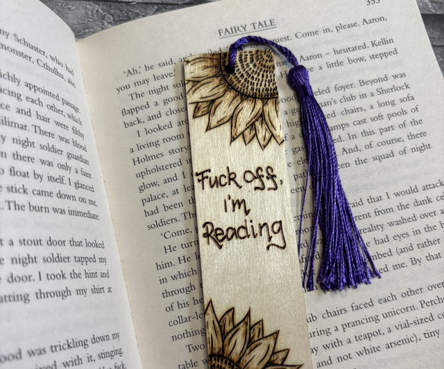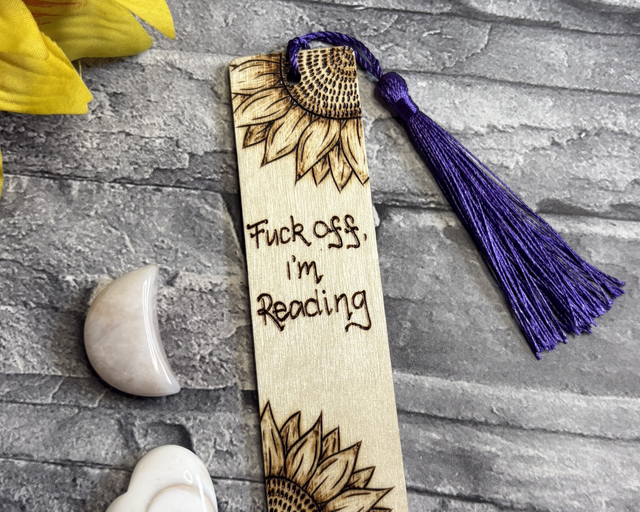 This one has the words, ‘fuck off I'm reading’ with two sunflowers burnt into opposite corners. It comes with a purple tassel.