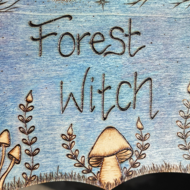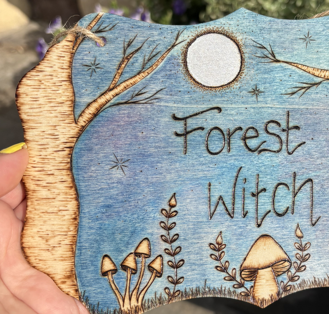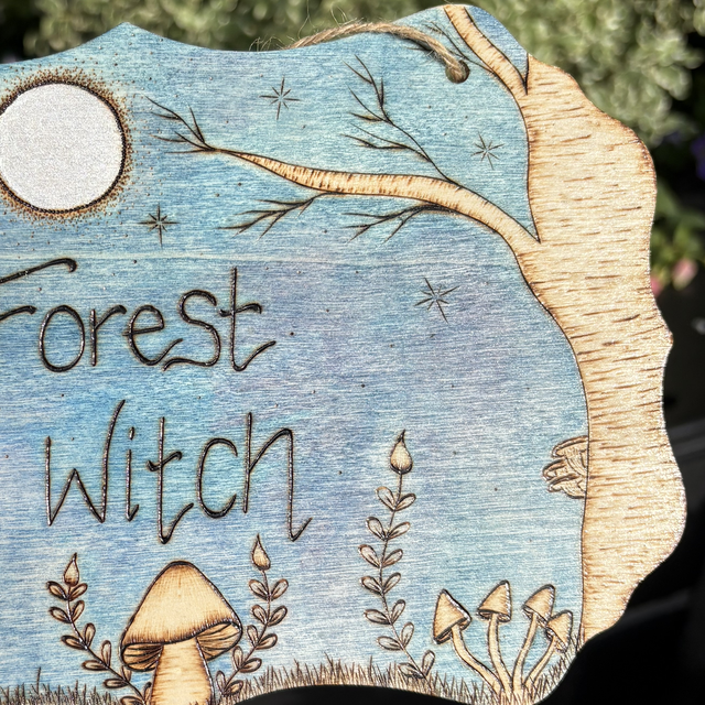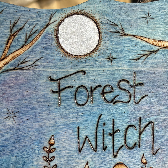 It’s has the words Forest witch burnt on with silver birch trees either side, a full moon and some mushrooms.