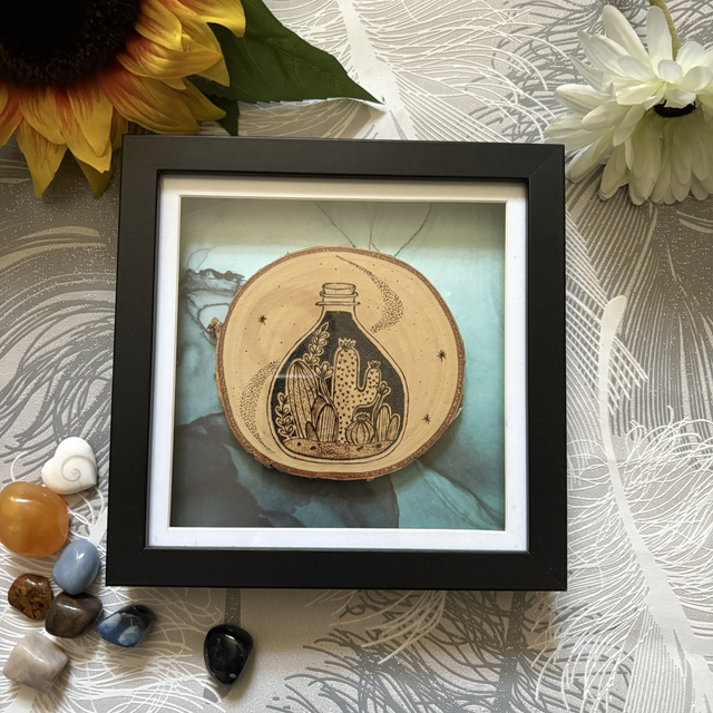 This is a beautiful unique one of a kind woodburnt silver birch slice, that I have burnt a fabulous variety of cacti in a jar with some detailing in the way of stippling behind it.
