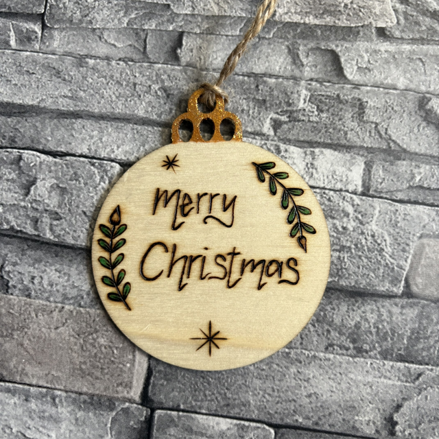 Here we have a cute Christmas decoration, a flat plywood bauble shape, that I have handburnt a snowflake onto, I’ve added little dots of glittery acrylic paint to jazz it up a bit too.