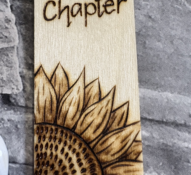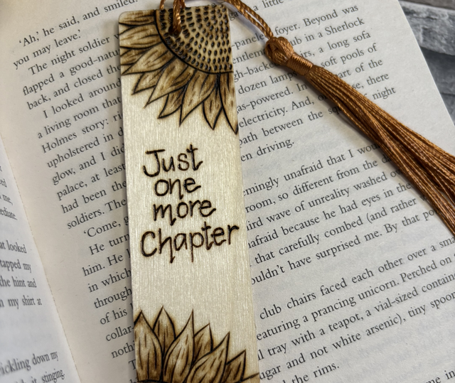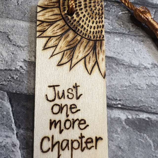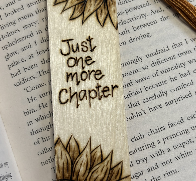 This bookmark has the words ‘just one more chapter’ burnt into it with two half sunflowers in adjacent corners.