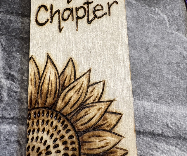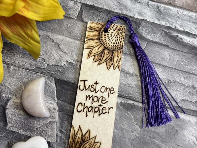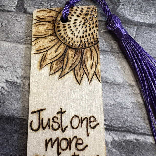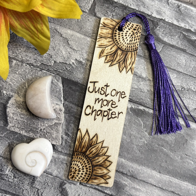 This bookmark has the words ‘just one more chapter’ burnt into it with two half sunflowers in adjacent corners.