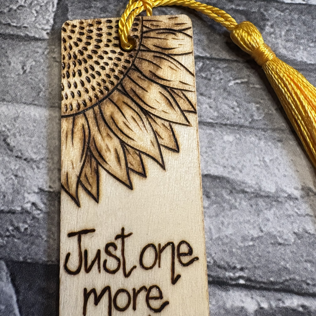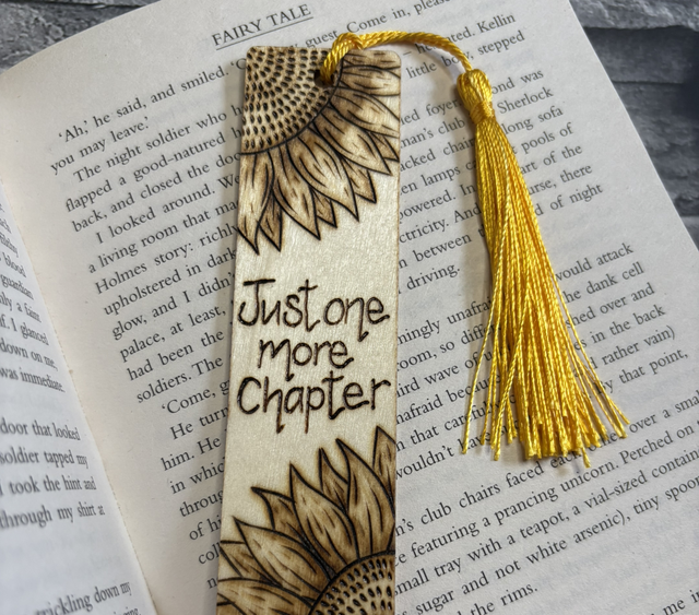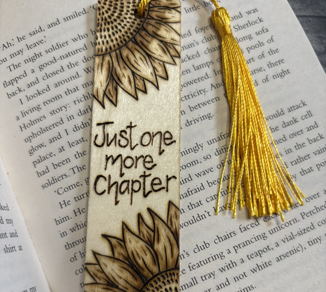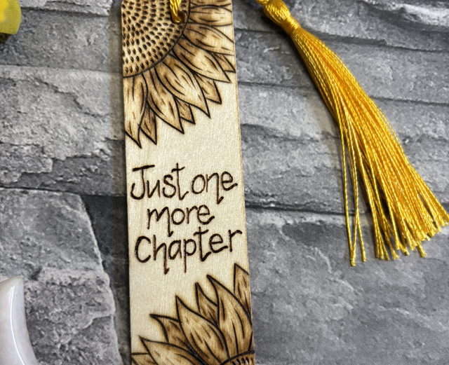 This bookmark has the words ‘just one more chapter’ burnt into it with two half sunflowers in adjacent corners.
