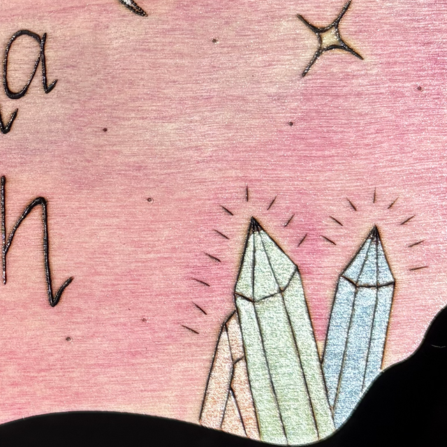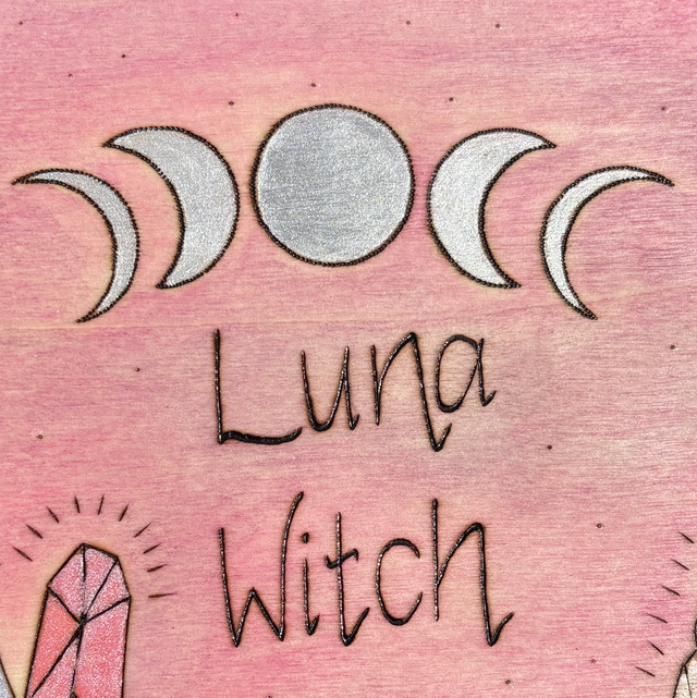 This is a plywood plaque that I’ve hand burnt with my Pyrography tool the saying ‘Luna witch’ on to with moon phases and crystals.
