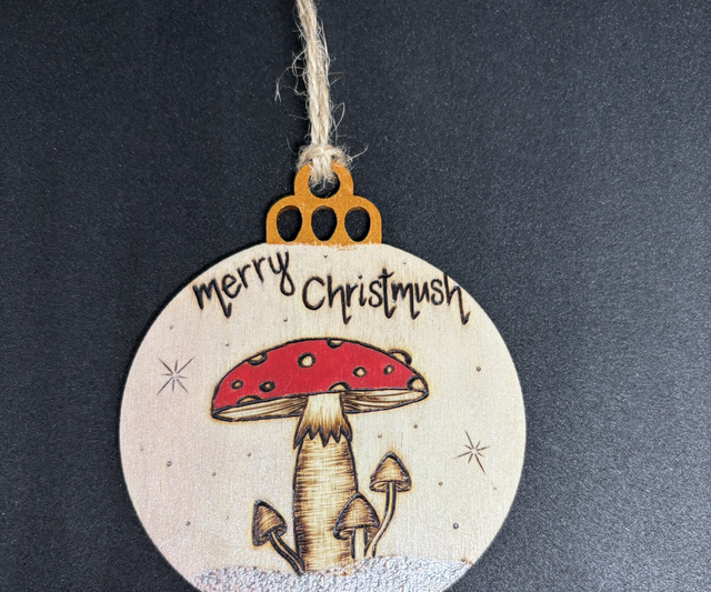 Here we have a cute Christmas decoration, a flat plywood bauble shape, that I have handburnt a flyagaric and small mushrooms onto, the flyagric has been painted a lovely deep red, the background has a very light wash of white shimmery watercolour, the back has been painted with a light red shimmery watercolour.