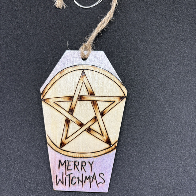 if you’re looking for a different kind of Christmas decoration this is for you! It is a plywood coffin shape that I have Hand burnt on pentacle with the words ‘Merry witchmas’ written underneath. I’ve also painted it with a lovely shimmery purple watercolour.