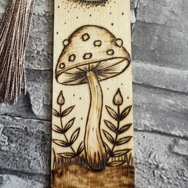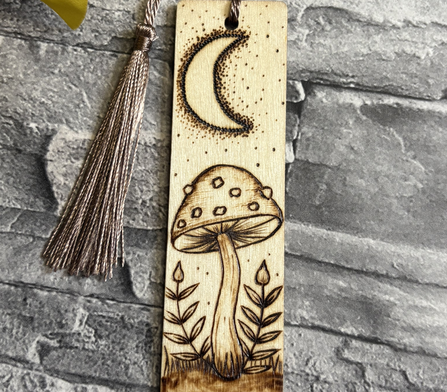 i’m a huge mushroom fan and get lots of inspiration from nature around me and from my walks into the woods. I enjoy bringing that inspiration into my burns. My bookmarks aren’t just functional they are also mini works of art. Each piece is sketched and then burnt by hand using my pyrography pen, I don’t use stencils so each one is totally unique.