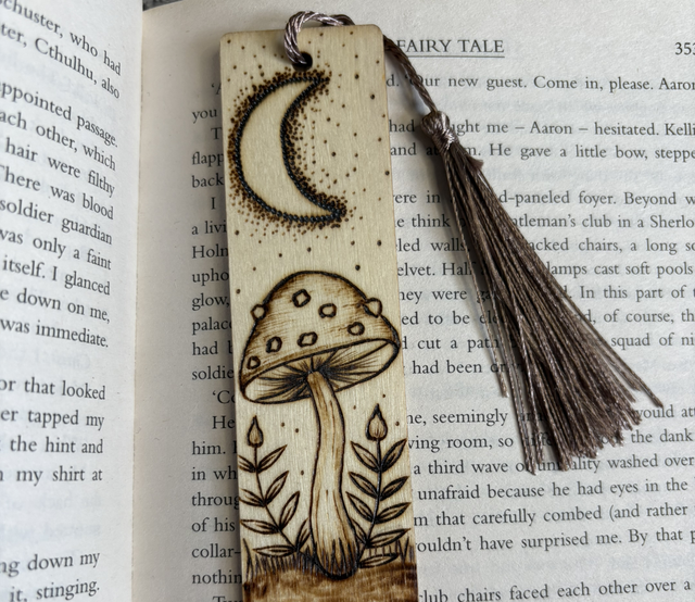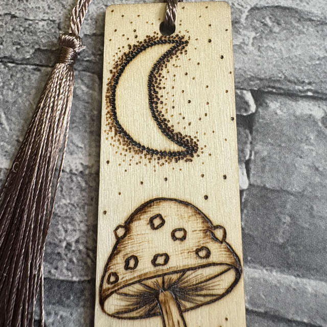 It’s a beautifully hand burnt fly agaric inspired design bookmark with a crescent moon at the top.