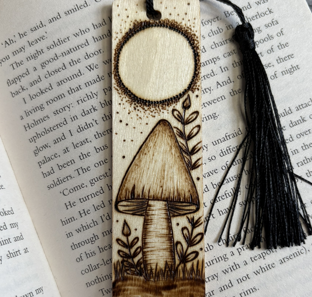 It’s a beautifully hand burnt mushroom inspired design bookmark with a full moon at the top.