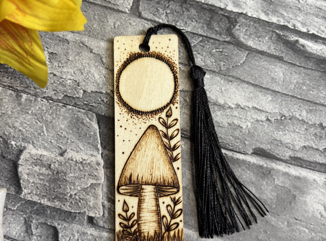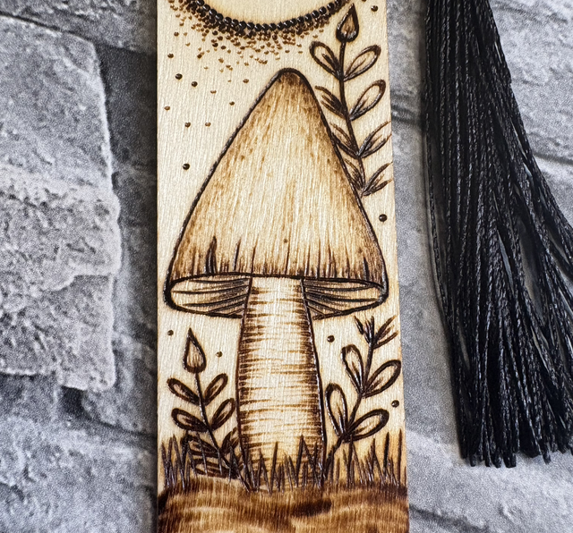 i’m a huge mushroom fan and get lots of inspiration from nature around me and from my walks into the woods. I enjoy bringing that inspiration into my burns. My bookmarks aren’t just functional they are also mini works of art. Each piece is sketched and then burnt by hand using my pyrography pen, I don’t use stencils so each one is totally unique.