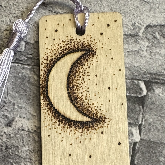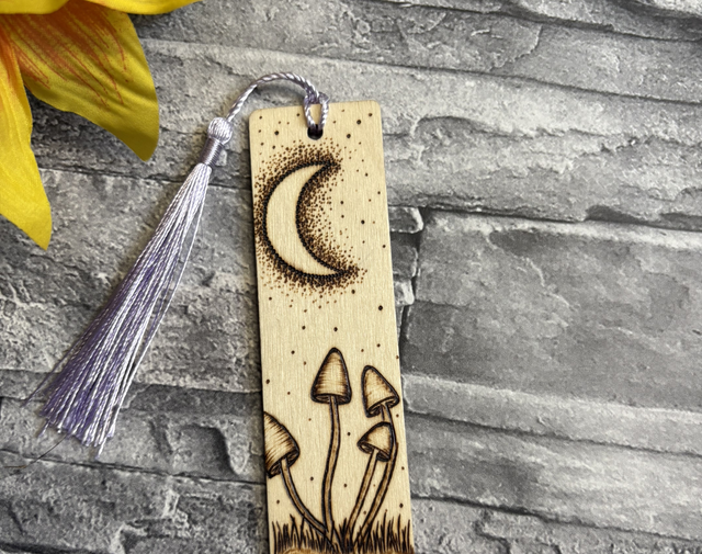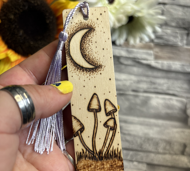 It’s a beautifully hand burnt cluster of mushrooms inspired design bookmark with a crescent moon at the top.