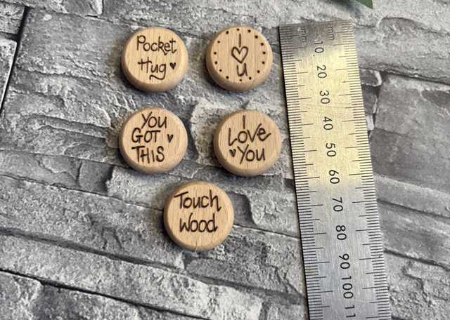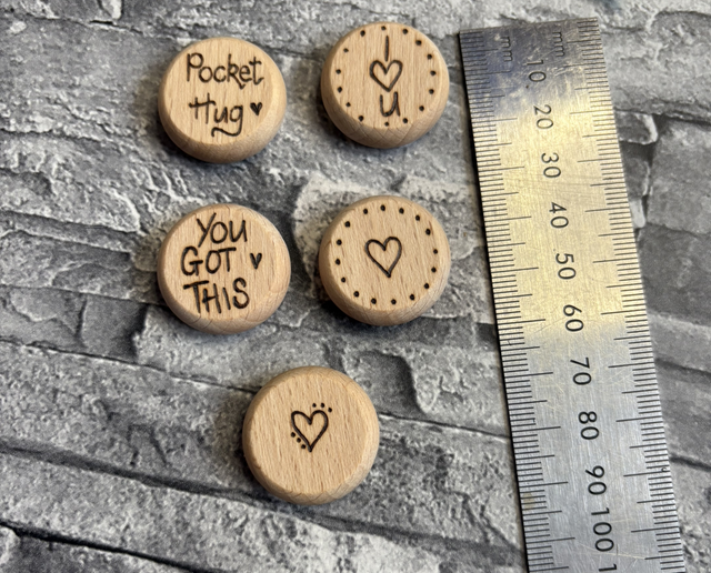 my pocket hugs could be the perfect thing! They are 2.5cm round and 0.8cm thick. I have burnt a small heart on the back of each one too. You can buy them individually for £2.00 or get 3 for £5 As they are all individually hand burnt they may vary slightly from the ones pictured. the hearts on the back will vary slightly too.
